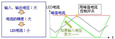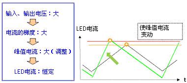 此方法利用輸入、輸出電壓的變化來(lái)改變線圈電流的梯度,其結(jié)果是LED電流值也變化。(圖3-1)