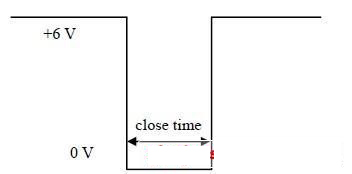 采用可控制開關的辦法難于完成測量,需采用其他辦法進行繼電器觸點通斷過程的模擬。首先對繼電器觸點處電壓波形進行分析,由于瞬時通斷測量儀接入抖閉觸點的電壓為6 V,通過抖斷觸點的電流為10 mA,當繼電器觸點出現(xiàn)抖閉現(xiàn)象時電壓波形應如圖3 所示(抖閉觸點在正常狀態(tài)時所加的+6 V 電壓在抖閉狀態(tài)時被直接短路,電位被鉗制在0 V),形成一個負跳變脈沖,其抖閉時間為脈沖寬度,而出現(xiàn)抖斷觸點的電壓波形如圖4 所示。