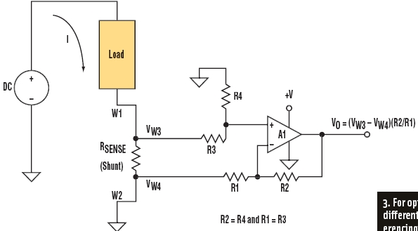 為避免引入這樣的誤差,需要進(jìn)一步增加兩個措施:采用開爾文連接方式與分流電阻相連并加入一個差分輸入放大器。開爾文連接是一種帶有兩條激勵引線和兩條傳感引線的4線連接(圖2)。其中兩條線(W1和W2)是激勵引線,它們將分流電阻連接到該電路的大電流端。另外兩條線(W3和W4)為傳感引線,它們將分流電阻兩端的電壓連接到放大器。這個方式將攜帶負(fù)載電流的導(dǎo)線與測量電路分離開來,并把W1和W2中的電壓降從分流電阻兩端的電壓測量中清除。為了進(jìn)一步有效利用開爾文連接的優(yōu)點,還需加入一個差分放大器(如圖3)。