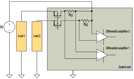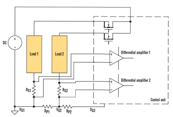 由于低端測量例子可能產(chǎn)生共模問題,這里考慮圖4所示的分布負(fù)載系統(tǒng)。虛線框中的控制單元使用MOSFET來控制輸送到兩個負(fù)載的功率。電源、負(fù)載和控制單元之間的寄生電阻RP1和RP2代表接地引線電阻和連接器電阻之和。在實際電路中,它們的數(shù)值可能為幾百毫歐。對于這個例子,假設(shè)RP1和RP2為0.2 Ω。差分放大器1和2與圖3中的差分放大器類似。