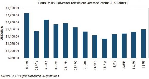 高檔品牌與價(jià)值品牌在同樣的市場(chǎng)環(huán)境中激烈競(jìng)爭(zhēng)。IHS iSuppli公司的研究顯示,7月美國(guó)平板電視價(jià)格連續(xù)第四個(gè)月環(huán)比上漲。平均銷售價(jià)格為1150美元,比6月上升1.5%,但比2010年7月下滑9%,如圖所示。尤其是,今年上半年推出的新型號(hào)銷售增長(zhǎng),在市場(chǎng)疲弱之際幫助支撐了需求。零售商也報(bào)告稱,由于價(jià)格較低,32英寸及更小尺寸的電視銷售情況改善。