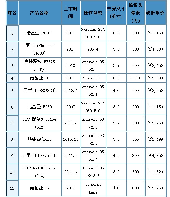 - 諾基亞C5-03領銜,蘋果、摩托羅拉產(chǎn)品緊跟