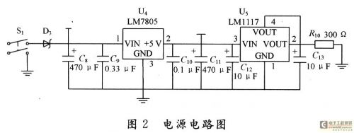 不同芯片對供電電壓的要求也不同,本測試系統(tǒng)中,單片機(jī)P89LPC938所需的電壓為3.3 V,而電平轉(zhuǎn)換芯片MAX232所需要的電壓為5 V,因此,電源模塊的設(shè)計(jì)要滿足需求,設(shè)計(jì)時就需要兼顧兩者,外部只需提供12 V電壓即可。圖2給出電源電路的電路圖,本系統(tǒng)選用LM7805和LM1117兩個穩(wěn)壓器。