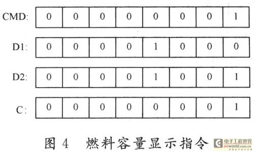 (2)單片機(jī)P89LPC938通過串口接收到“volume”命令,從指令集中提取相應(yīng)的指令信號。圖4給出單片機(jī)向燃料開關(guān)發(fā)出的一條燃料容量顯示指令。