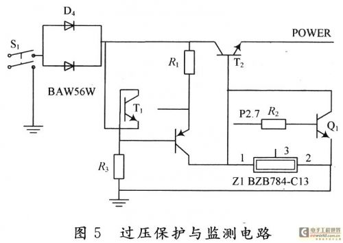 燃料開關(guān)外部需+12 V電壓供電,經(jīng)產(chǎn)品內(nèi)部電源電路轉(zhuǎn)化為+5 V電壓給單片機(jī)提供電壓,因此如果其電源電路出現(xiàn)故障,或受到汽車內(nèi)其他電器設(shè)備的電壓干擾使提供給單片機(jī)的電壓過高,或由于其他形式的制造缺陷,都有可能使被測開關(guān)的電源異常,這會損壞燃料開關(guān),進(jìn)而損壞與相連接的測試系統(tǒng)。因此,需要設(shè)計(jì)一個過壓保護(hù)與檢測電路,檢測燃料開關(guān)內(nèi)的單片機(jī)的電源電壓,當(dāng)此電壓正常時(+5 V±2%),測試系統(tǒng)可以繼續(xù)對其檢測,但當(dāng)此電壓過高,則自動切斷燃料開關(guān)的外部電源,達(dá)到保護(hù)燃料開關(guān)的目的。圖5即為該保護(hù)電路。