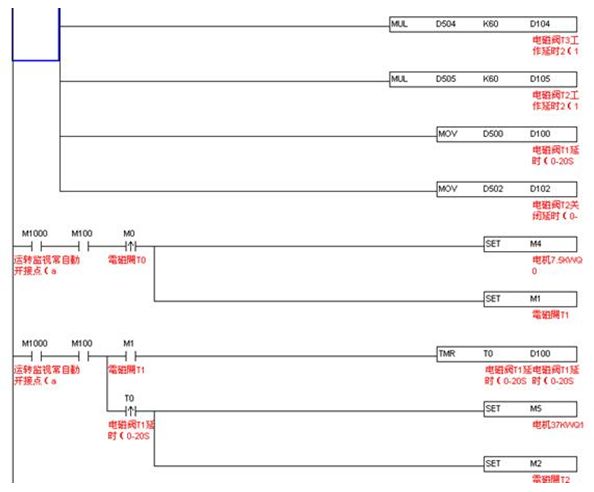 PLC程序主要分為以下基本:初始化部分、模擬量采集部分、數(shù)據(jù)處理部分、邏輯控制部分(手動和自動)、報警部分等組成。圖4為部分PLC程序設計。