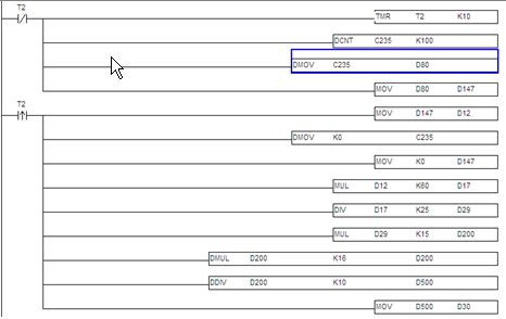 3.2.1測速程序:此部分程序原理就是采用PLC內(nèi)置的高速計算功能,計算單位時間內(nèi)從測速編碼器過來的脈沖數(shù),然后根據(jù)相關機械系數(shù)折算成線速度,這個值作為計算供水泵頻率的一個系數(shù),然后根據(jù)濕度設定值,計算出實際所需的供水頻率。見圖8。