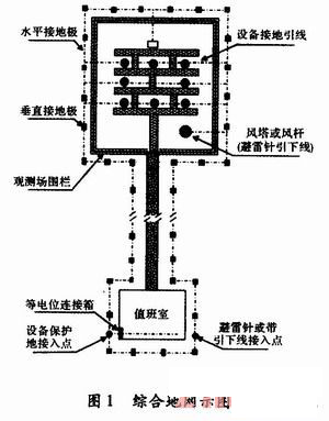 自動(dòng)氣象站場(chǎng)、室宜采用共用接地系統(tǒng)。該接地系統(tǒng)由工作室地網(wǎng)與室外觀測(cè)場(chǎng)地網(wǎng)共同組成,如圖1所示,兩地網(wǎng)間的連接應(yīng)使用組合式接地體進(jìn)行連接。連接帶的埋設(shè)深度應(yīng)≥600mm。