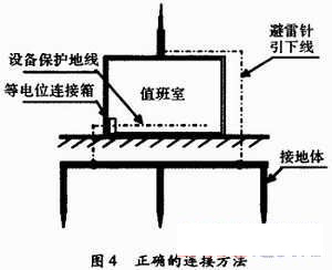 等電位連接是把值班室內(nèi)所有設(shè)備如采集器、計(jì)算機(jī)、打印機(jī)、UPS電源、通信機(jī)柜及附近的所有金屬物,如混凝土內(nèi)的鋼筋,金屬柜、金屬門窗及其他金屬管道、電力系統(tǒng)的零線等用電氣連接的方法連接,使整座建筑物成為一個(gè)良好的等電位體。當(dāng)雷電襲來時(shí),由于建筑物內(nèi)部及其附近基本上做到等電位,因而不會(huì)發(fā)生建筑物內(nèi)部的設(shè)備被高電位反擊和人被雷擊的事故。由于采用了等電位連接,對(duì)建筑物接地電阻的要求可適當(dāng)放寬。這一點(diǎn)對(duì)于土壤電阻率較高的臺(tái)站尤為重要。