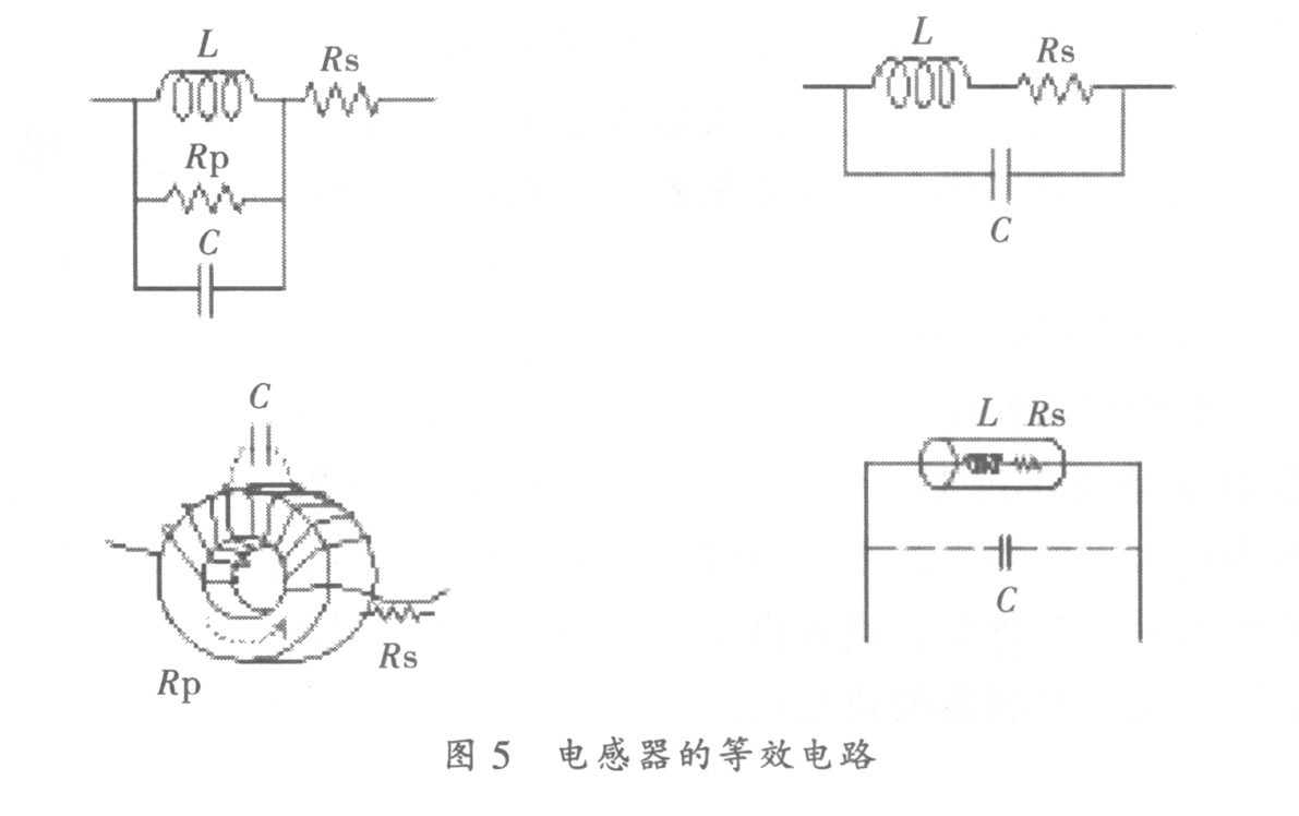 電感器由纏繞在磁芯上的導(dǎo)線構(gòu)成, 其特性則由所使用的磁芯材料決定??諝馐菢?gòu)成電感器最簡單的磁性材料, 但為使電感器具有更高的電感量,經(jīng)常用鐵、鐵氧體等磁性材料做磁芯。電感器的典型等效電路如圖5 (a) 所示, 圖中Rp 代表磁性的鐵耗, Rs 代表導(dǎo)線的銅耗, C 是繞線間的分布電容。對于低值電感應(yīng)使用圖5 (b) 所示的等效電路。由于L 值很小, 繞組間的分布電容就成了主要的影響因素。
