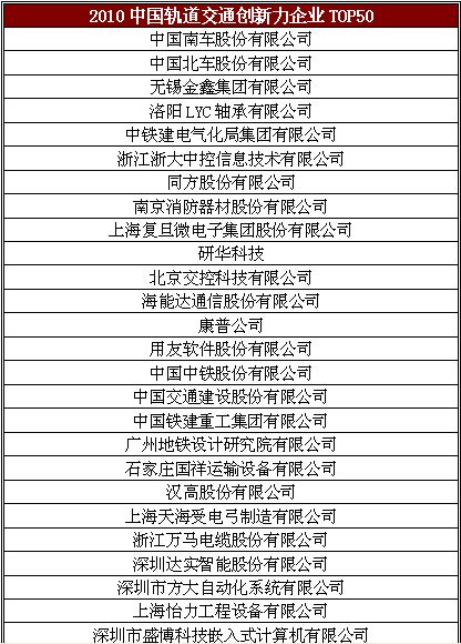 軌道交通創(chuàng)新力企業(yè)TOP50評(píng)價(jià)活動(dòng)是軌道交通行業(yè)唯一的創(chuàng)新指數(shù)榜。自2008年起,由RT《軌道交通》雜志發(fā)起主辦,陸續(xù)得到《人民鐵道報(bào)》、中國(guó)企業(yè)評(píng)價(jià)協(xié)會(huì)的支持與聯(lián)合主辦。每年發(fā)布一次榜單并編輯出版該年度的產(chǎn)業(yè)發(fā)展報(bào)告。RT TOP50以關(guān)注軌道交通行業(yè)創(chuàng)新的投入、產(chǎn)出、應(yīng)用為主線,旨在總結(jié)梳理軌道交通行業(yè)的創(chuàng)新取得的成果,樹(shù)立行業(yè)創(chuàng)新標(biāo)桿,見(jiàn)證并推動(dòng)軌道交通行業(yè)技術(shù)創(chuàng)新、管理創(chuàng)新及制度創(chuàng)新的發(fā)展,推動(dòng)創(chuàng)新精神在產(chǎn)業(yè)進(jìn)步中發(fā)揮力量。