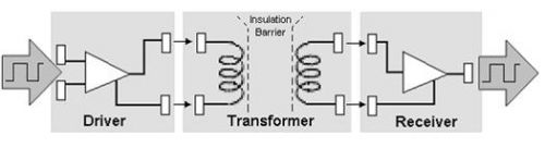 感應隔離技術使用了一對通過一個絕緣層分離的線圈。該絕緣層防止任何物理信號的傳輸。信號可以通過改變流經(jīng)其中一個線圈的電流進行傳輸,因為這樣會使跨過該絕緣層在第二個線圈中產(chǎn)生類似的感應電流。感應隔離技術可以提供與電容技術相似的高速傳輸。但是由于感應耦合涉及到用于數(shù)據(jù)傳輸?shù)拇艌龅氖褂茫虼怂资艿酵獠看艌龅母蓴_。