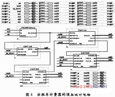 頂層設(shè)計采用原理圖輸入方式。通過調(diào)用生成的各模塊符號,并將它們作適當(dāng)連接以實(shí)現(xiàn)頂層文件的設(shè)計。出租車計費(fèi)器的頂層設(shè)計電路,如圖4所示。