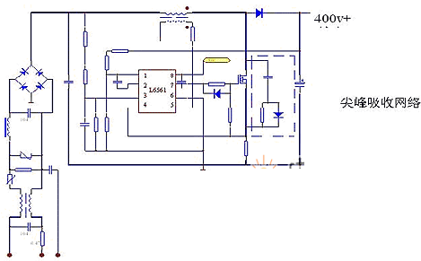 3.在低電壓時(shí),MOS 的升壓電流更大(PWM 輸出導(dǎo)通較寬)MOS 溫升較高。這時(shí)可將電壓范圍設(shè)定為接近值,例如:120v~260v 時(shí)同等負(fù)載測(cè)試時(shí),可將電感的感量及匝數(shù),按照260v 時(shí)的輸入值,設(shè)定并最大可能減少次級(jí)匝數(shù)。在120v 時(shí)可將輸入最低電壓設(shè)定為110v最大限度增加電感感量,使母線在110v 滿載時(shí)輸出達(dá)到額定的400v。在260v 時(shí)設(shè)定次級(jí)是由于輸入電壓升高,輸入電流減小會(huì)使次級(jí)電壓下降,5 腳電流采樣失效,使芯片進(jìn)入重新啟動(dòng)(誤以為空載)母線不斷脈動(dòng)的重新啟動(dòng)。110V 調(diào)試時(shí)感量大,可減少因輸入電壓低而導(dǎo)致的PWM 頻率太高,帶來的MOS 開關(guān)損耗,感量大時(shí)亦可有效減少峰值電流的值。另一減少M(fèi)OS 溫升的方式是并聯(lián)一路吸收網(wǎng)絡(luò)。電阻并聯(lián)高速二極管后在串聯(lián)一只電容可使MOS 開關(guān)時(shí)的尖峰反向電壓得到有效吸收。(小功率無明顯優(yōu)勢(shì))。