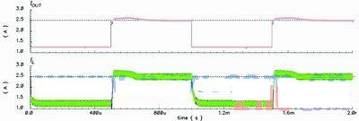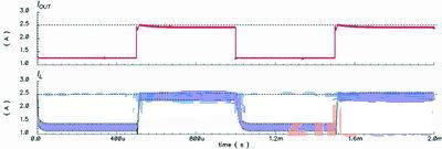 為了說(shuō)明這個(gè)方案,圖1中的降壓轉(zhuǎn)換器會(huì)采用這些配置:L=20mH、COUT=47mF、RL值在2.64W(正常模式)~1.1W(電流限制模式)間轉(zhuǎn)換,并會(huì)使用一個(gè)tD=100ns的比較器,而IOUT(CL,DES)和IL(RIPPLE)分別是2.5A和0.3A。不過(guò),如果使用傳統(tǒng)的峰值電流限制方法,那么式(1)中的IV便會(huì)設(shè)定為2.35A,傳統(tǒng)方法的模擬結(jié)果如圖4所示。由此可以看到,IOUT(CL)會(huì)由于tD的影響而低于2.5A。然而,使用新方法并將ILR設(shè)定在2.5A,IOUT(CL)便可如圖5所示達(dá)到2.5A。于是,傳統(tǒng)方法中出現(xiàn)的問(wèn)題便能夠在該方案中解決。