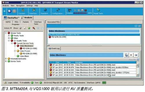除了附加有視頻PID帶寬測量以外,VQS1000的顯示和操作幾乎與MTM400A的文件模式應(yīng)用一樣。VQS1000的另一項功能是當(dāng)它與MTM400A聯(lián)用時,所有的觸發(fā)均通過SNMP返回到MTM400A。此外,還有一項測試稱為AV質(zhì)量測試也是很有用的,如圖3所示,MTM400A可以跟蹤VQS1000黑幀、凍結(jié)幀和塊效應(yīng)測量的觸發(fā)事件。