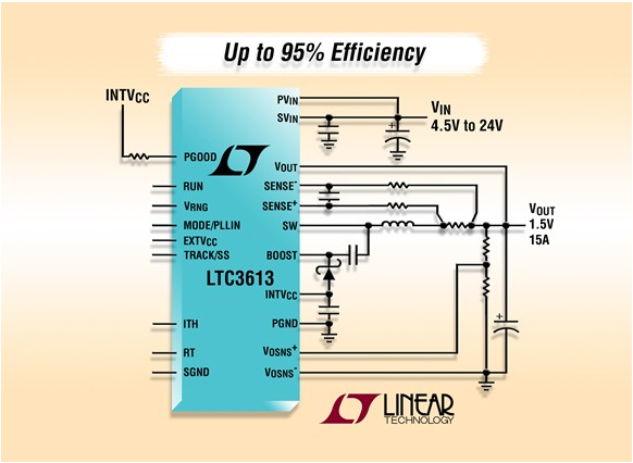 凌力爾特公司 (Linear Technology Corporation) 推出高頻、接通時間受控的同步降壓型 DC/DC 轉換器 LTC3613,該器件具差分輸出電壓采樣和時鐘同步。受控的接通時間和谷值電流模式架構在瞬態(tài)事件時可通過提高工作頻率以實現(xiàn)非??焖俚乃矐B(tài)響應,從而允許 LTC3613 僅在幾個時鐘周期內(nèi)就可從大的負載步進中恢復。其 4.5V 至 24V 的輸入范圍支持多種應用,其中包括大多數(shù)中間總線電壓。集成的 N 溝道 MOSFET 可在 0.6V 至 5.5V 的輸出電壓范圍內(nèi)提供高達 15A 的連續(xù)負載電流,從而使該器件非常適用于負載點應用。