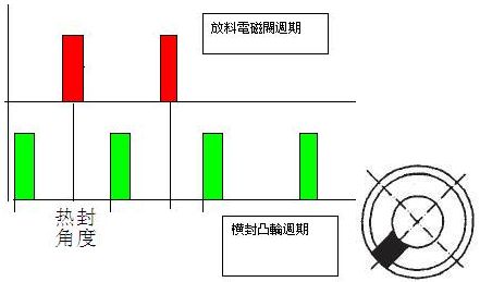 根據(jù)熱封的電子凸輪周期0~360設(shè)定促發(fā)開(kāi)啟放料閥即可。比如,在開(kāi)機(jī)前假設(shè)設(shè)定50度,放料。實(shí)際出現(xiàn)夾料。調(diào)整促發(fā)角度到150,直到合適為止。因?yàn)槁淞蠒r(shí)間足夠短,一個(gè)周期按120袋來(lái)算也有500ms。