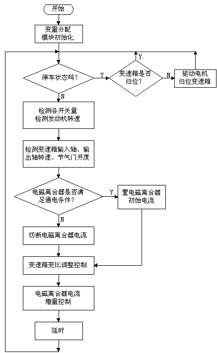 TCU控制系統(tǒng)主程序框圖如圖3所示。程序首先對內(nèi)部RAM進(jìn)行分配,然后對各功能模塊如Administrator/D轉(zhuǎn)換器、定時器、PWM波形發(fā)生器等進(jìn)行初始化。變速箱的變比在汽車每次時應(yīng)處于最小變比的位置,因此在每次停車時應(yīng)將變速箱歸位,汽車起動后首先檢測各參數(shù),如檔位開關(guān)、發(fā)動機轉(zhuǎn)速、節(jié)氣門開度、變速箱輸入、輸出軸轉(zhuǎn)速等。這些參數(shù)是控制電磁離合器電流和電動機狀態(tài)的依據(jù)。當(dāng)需要增加變速箱的變比時,TCU控制電機正轉(zhuǎn),反之控制電機反轉(zhuǎn)。電磁離合器的控制采用電流增量控制方式。它的控制好壞,直接影響汽車運行的平穩(wěn)性和經(jīng)濟(jì)性。
