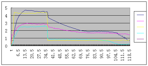 注:深藍(lán)—輸入軸轉(zhuǎn)速,黃—節(jié)氣門開度,紫紅—發(fā)動機轉(zhuǎn)速,淺藍(lán)—電磁離合器電流