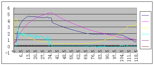 圖5為汽車速度從零加到120KM/H后又由120KM/H減到零時,位置傳感器與輸入軸轉(zhuǎn)速、輸出軸轉(zhuǎn)速和電機電壓之間的關(guān)系曲線。由圖可知,當(dāng)汽車速度在從零加到120KM/H過程中,位置傳感器變比由最大開始下調(diào)直到變?yōu)樽钚?,此時對應(yīng)電機反轉(zhuǎn)。當(dāng)車速由120KM/H開始下降時位置傳感器先保持不變,此時電機不轉(zhuǎn),同時輸入軸轉(zhuǎn)速和輸出轉(zhuǎn)速成比例的下降,當(dāng)車速達(dá)到一定的值時位置傳感器速比由最小開始上調(diào)直到為最大值,此時電機反轉(zhuǎn)(因測試時采用的電流傳感器為單方向的,所以圖中沒有反映出反向電流)。輸入軸轉(zhuǎn)速和輸出軸轉(zhuǎn)速不成比例的下降直至為零。從圖5可以看到車速在上升時,位置傳感器速比的測試值不斷地減?。▽?yīng)的轉(zhuǎn)速比增大)。反之,車速在下降的過程中,當(dāng)車速小于某一值時測試值增加。從而實現(xiàn)了變速箱變比的自動調(diào)整。