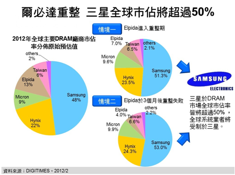 DIGITIMES Research分析師柴煥欣分析,受DRAM價(jià)格自2011年第1季持續(xù)性下滑影響,加上日?qǐng)A匯率亦持續(xù)升值加重成本負(fù)擔(dān),全球第3大DRAM供貨商爾必達(dá)(Elpida)在歷經(jīng)連續(xù)5季虧損后,終于無(wú)法支撐,于2012年2月27日無(wú)預(yù)警申請(qǐng)破產(chǎn)保護(hù),并將進(jìn)行重整。