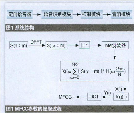 車載語音控制器系統(tǒng)由定向拾音器、語音識(shí)別模塊、控制模塊和音響模塊組成。系統(tǒng)的功能是:由拾音器采集駕駛員發(fā)出的語音命令,利用語音識(shí)別模塊將拾音器輸出的語音物理聲音信號(hào)轉(zhuǎn)變成語音數(shù)字信號(hào),并識(shí)別出語音命令對(duì)應(yīng)的漢字或詞語,之后由控制模塊產(chǎn)生與之對(duì)應(yīng)的詞條編碼指令,通過系統(tǒng)I/O口線將控制命令傳達(dá)給音響,車載音響接收到控制指令產(chǎn)生動(dòng)作,響應(yīng)駕駛員的語音命令,比如快進(jìn)、快退或音量調(diào)節(jié)等。系統(tǒng)結(jié)構(gòu)及原理框圖如圖1 所示: