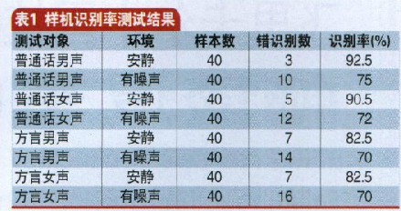 本系統(tǒng)的樣機(jī)實(shí)驗(yàn)主要是測(cè)試非特定人的語音識(shí)別率和模擬開關(guān)動(dòng)作的準(zhǔn)確率。由于汽車音響的語音詞條為2~4個(gè)字,語音識(shí)別率實(shí)驗(yàn)內(nèi)容為車載音響常用2字詞條指令18條、3字詞條指令12條、4字詞條指令10條,實(shí)驗(yàn)對(duì)象為6人4男、2女(普通話和方言),實(shí)驗(yàn)環(huán)境為噪聲干擾環(huán)境和相對(duì)安靜環(huán)境,樣機(jī)測(cè)試結(jié)果如表1所示?! ?/p>