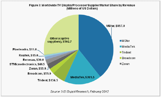 據(jù)IHS iSuppli公司的顯示電子專題報(bào)告,憑借與中國(guó)大陸廠商的緊密關(guān)系和清晰的產(chǎn)品策略,臺(tái)灣半導(dǎo)體芯片供應(yīng)商晨星與聯(lián)發(fā)科2011年幾乎完全統(tǒng)治了電視視頻處理器市場(chǎng),而包括英特爾在內(nèi)的幾家廠商則認(rèn)負(fù)出局。