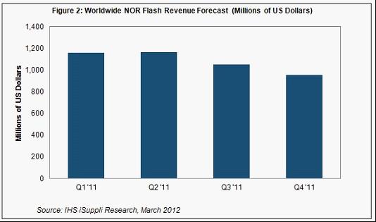 據(jù)IHS iSuppli公司的移動市場存儲報告,由于經(jīng)濟(jì)形勢糟糕和泰國洪災(zāi)導(dǎo)致PC出貨量下降,2011年第四季度NOR閃存營業(yè)收入環(huán)比下降9%。