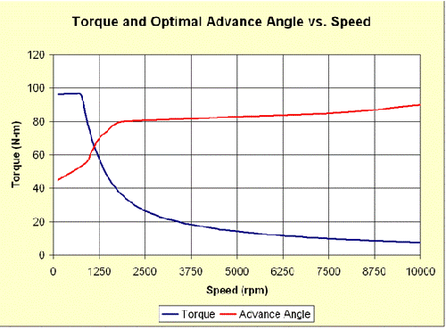 這幅圖中可以提取每個(gè)轉(zhuǎn)速下優(yōu)化超前角的峰值轉(zhuǎn)矩。當(dāng)電機(jī)超過恒轉(zhuǎn)矩區(qū)域(大概875轉(zhuǎn)/分)后,弱磁的優(yōu)勢(shì)突顯出來。