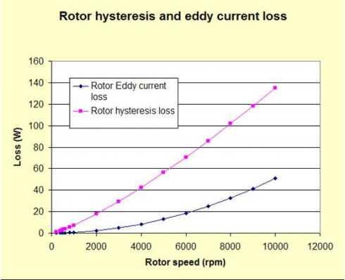 銅損是電機(jī)整體損耗中關(guān)鍵的部分,MotorSolve先進(jìn)的損耗計(jì)算能力能計(jì)算出基于元件級(jí)的磁滯和渦流損耗。上圖表明轉(zhuǎn)子的磁滯和渦流損耗是轉(zhuǎn)速的函數(shù)(或等價(jià)的是頻率的函數(shù))。渦流趨勢(shì)呈現(xiàn)拋物線型,而磁滯損耗與功率曲線規(guī)律相似。