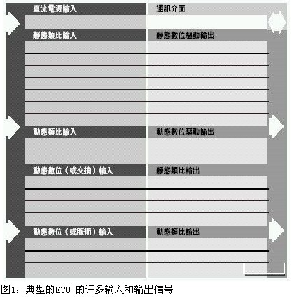 ECU 利用許多信號來監(jiān)控汽車及其環(huán)境,進而管理與控制引擎和輔助設備,以達到最佳的運作狀態(tài)。圖1摘要了典型的ECU 的許多輸入和輸出信號。