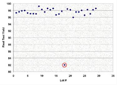 圖4最終測試良率(超負載試驗前)和標出不符合統(tǒng)計良率限值的點的示例圖。該點是一個異常值,是要求進一步篩選和分析的風險點,也可能會出現(xiàn)不合格品。
