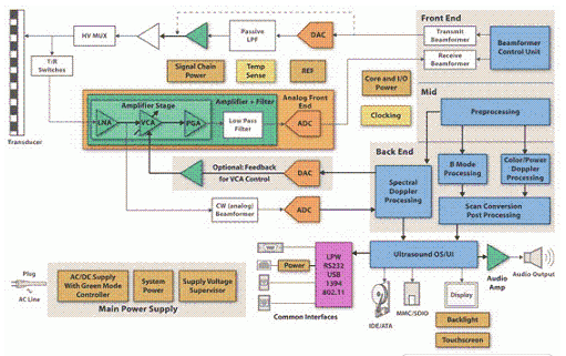 很明顯,在高端便攜式系統(tǒng)之間實現(xiàn)共享信號處理單元是非常困難的。但是,在不考慮不同性能要求的情況下,超聲波系統(tǒng)通常擁有相似的接收通道架構(gòu)。