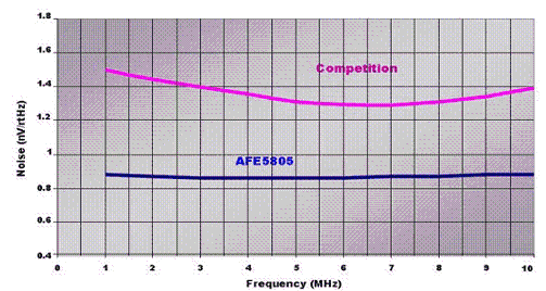 除了功耗以外,AFE 噪聲是超聲波系統(tǒng)設(shè)計人員需要考慮的第二個問題。來自超聲波變送器接收信號的振幅可能會為介于 10uVPP 到 1VPP [1] 不等。能夠被探測到的信號越小,系統(tǒng)的靈敏度就越高。輸入等效電流和輸入等效電壓噪聲都會影響系統(tǒng)靈敏度。通常,我們?yōu)楦叨说降投说南到y(tǒng)選擇 0.7 nV/rt(Hz)~1.5 nV/rt(Hz) (RTI)的噪聲參數(shù)。經(jīng)在現(xiàn)實系統(tǒng)中證實,這些噪聲參數(shù)足以產(chǎn)生高質(zhì)量的圖像。