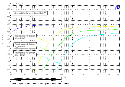 對(duì)于 100Hz 的截止頻率及 16Ω 的耳機(jī)喇叭阻抗,電容必須是 110μF。對(duì)于需要小體積尺寸的情況而言,這會(huì)造成電容值及實(shí)體尺寸過大,而且使得成本過高。許多工程人員只能改用 22μF 的較小電容,不過這會(huì)影響耳機(jī)的低頻率傳真度,而導(dǎo)致低音響應(yīng)不佳。