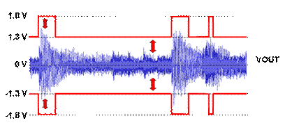 G 類放大器一般使用多個(gè)電源電壓,以發(fā)揮比 AB 類放大器更高的效率。在本例中,TI 最新的 G 類 DirectPath 放大器 (TPA6140A2) 首先將電池電壓降低至較低的電壓值,然后切換至低信號(hào)強(qiáng)度的低供應(yīng)電壓 (1.3V),并且只有在信號(hào)強(qiáng)度超出該低電源電壓軌時(shí),才切換至較高的電源電壓 (1.8V)。這些適應(yīng)性電源電壓軌的升降速度高于音頻,因此可避免失真或削波。此外,由于一般聆聽的音頻低于 200mVRMS,因此電源電壓通常是最低值 (亦即 1.3V),并且提供優(yōu)于上述 AB 類放大器的效率。在音頻的無噪聲階段期間,整個(gè)電源軌的電壓會(huì)降低,而且信號(hào)相當(dāng)小。當(dāng)音頻變得大聲時(shí),放大器會(huì)切換至較高的電源軌,然后切換回較低的電源軌,導(dǎo)致整個(gè)輸出 FET 的電壓降幅縮小。圖 7 的紅色箭頭表示此電壓降幅。