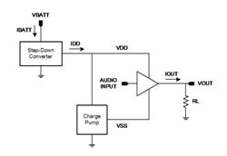 其中的技巧是設(shè)計(jì)將電池電壓降低至較低電壓的放大器,并使用適應(yīng)性電源軌 (分別有負(fù)電源軌) 降低播放音樂時(shí)整個(gè)輸出 FET 的電壓降幅。其中一種實(shí)現(xiàn)這類放大器的方式是,使用電荷泵作為圖 8 所示的步降區(qū)塊。某些工程人員偏好這類做法,原因在于步降電荷泵僅需要相對(duì)較小的飛馳電容(flying capacitor) (1μF 至 2.2μF),而這也是相對(duì)較小的組件