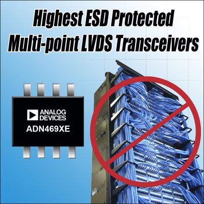 Analog Devices, Inc. (NASDAQ:ADI),全球領(lǐng)先的高性能信號處理解決方案供應(yīng)商,最近推出一系列多點(diǎn)、低電壓、差分信號(M-LVDS)收發(fā)器ADN469xE,具有所有多點(diǎn)LVDS收發(fā)器中最高的ESD(靜電放電)保護(hù)。 ADN469xE M-LVDS系列包含八款收發(fā)器,每款器件都能夠利用一條差分電纜對連接32個數(shù)據(jù)/時鐘節(jié)點(diǎn)并以100 Mbps或200 Mbps的數(shù)據(jù)速率工作。與之相比,傳統(tǒng)的LVDS通信鏈路必須使用32個單獨(dú)的點(diǎn)對點(diǎn)節(jié)點(diǎn),這會顯著增加功耗、連接器尺寸、線纜成本和總電路板空間。ADI公司的ADN469xE M-LVDS系列可提供8 kV IEC ESD保護(hù),是M-LVDS收發(fā)器競爭產(chǎn)品的11倍。這種更高層次的保護(hù)能夠提高可插拔板和卡的可靠性,適合無線基站和網(wǎng)絡(luò)基礎(chǔ)設(shè)施、數(shù)據(jù)采集、自動測試設(shè)備以及其他高速、高度網(wǎng)絡(luò)化背板和電纜應(yīng)用。