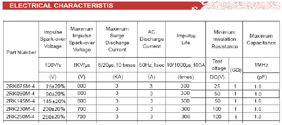 DC spark-over voltage : 定義為以 100V/S 或1000V/S 的上升電壓所測試出來的擊穿電壓叫直流擊穿電壓,一般符合于標(biāo)稱直流擊電壓的±20%范圍之間;