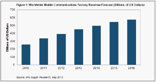 上述預測數(shù)據(jù)由無線通信產業(yè)各領域中的OEM廠商的總體工廠營業(yè)收入構成,包括手機、媒體平板和移動基礎設備等主要領域,以及無線路由器、無繩電話、電池充電器和灰市手機等輔助領域。
