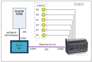 該系統(tǒng)主要配置包括ES2R控制器 1 臺,B05S100觸摸屏1臺,高壓防爆變頻器1臺,6枚按鈕防爆。整個系統(tǒng)中,除6枚防爆按鈕安裝在防爆柜面板外,其余部分都封閉于防爆柜體內(nèi),變頻器所有操作通過6枚按鈕完成。因為處于防爆環(huán)境中,不能直接操作接觸摸屏,所以要通過PLC的6個輸入點外接防爆按鈕來代替在觸摸屏上的操作。該方案的靈活之處就是避免了操作人員直接觸摸屏,從而防止事故發(fā)生。