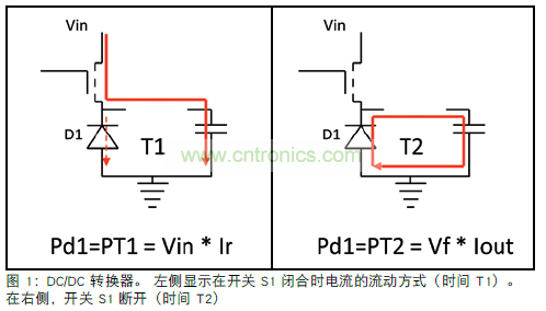 圖 1 顯示非同步 DC/DC 降壓轉(zhuǎn)換器的結(jié)構(gòu)框圖。 在T2 期間,輸出電流 (Iout) 流過肖特基二極管 D1。 產(chǎn)生的損耗與D1的正向電壓 (Vf)和 Iout直接相關(guān)。 T2 (PT2)的功率損耗等于 Iout*Vf。 顯然,Vf需要盡可能地低,以限制損耗,并最大限度地減少熱量的產(chǎn)生。