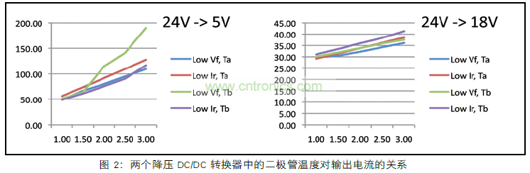 圖 2 還清楚地顯示輸入輸出電壓比。左圖顯示低占空比5 V輸出的D C / D C 轉(zhuǎn)換器。在較低的占空比時(shí),T2的時(shí)間較長,功耗也較高。這反過來使二極管更熱,使得Ir增加地更大,因此PT1變得更高??偟慕Y(jié)果是:在輸出電流增加時(shí),二極管的溫度會很快地升高。在電流較高時(shí),溫度實(shí)際上已經(jīng)超過了二極管規(guī)定的工作范圍。在圖 2 的右側(cè),較高的輸出電壓18V時(shí),它的占空比也比較高,這使得PT2損耗保持在可控制范圍內(nèi)。二極管上產(chǎn)生的熱量較少,使得Ir增加的幅度較小,因此,PT1會更少,并且整體溫度升高幅度較小。
