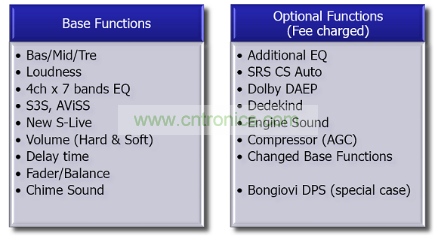 左邊表中是一些基本功能,其中S3S、AViSS、New S-Live是安森美半導體自己的算法,可免費提供給客戶;右邊是可供選擇的算法,需要使用授權,或更改時需要研發(fā)費用,其中包括業(yè)界知名的SRS CS Auto及Dolby DAEP算法,而Bongiovi DPS是最先進的音效處理技術。安森美半導體目前是該技術唯一的IC合作伙伴。