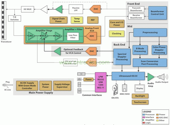 超聲波系統(tǒng)因其功能和性能不同而各異。例如,3D、4D 和諧波成像模式通常被用于高端系統(tǒng),而只有 2D B-模式成像和頻譜多普勒可能被用于一些低端系統(tǒng)。功能差異主要取決于數字后端。高 端超聲波系統(tǒng)要求更多和更快的計算能力,其需要具有接近實時信號處理的高端 DSP。很明顯,在高端便攜式系統(tǒng)之間實現(xiàn)共享信號處理單元是非常困難的。但是,在不考慮不同性能要求的情況 下,超聲波系統(tǒng)通常擁有相似的接收通道架構。