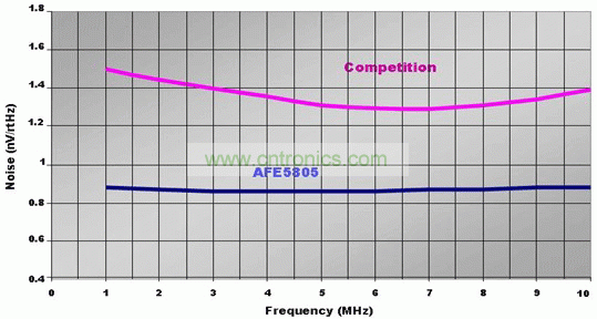 為了滿足上述標準,我們需要一個超聲波 AFE(例如 TI 的 AFE5805)。最為先進的 BiCMOS 和 CMOS 技術用于對功耗和噪聲性能進行優(yōu)化。由于其低功耗、小芯片尺寸以及較低的閃爍噪聲, BiCMOS 工藝是 AFE5805 VCA 部分的理想之選。CMOS 工藝非常適用于模數轉換器。與同類解決方案相比,這些綜合的創(chuàng)新使尺寸縮小了 50%,功耗降低了 20%,噪聲減少了 40%。圖 2 所示的恒 定噪聲性能涵蓋了整個工作頻率范圍。因此,我們設計的便攜式超聲波系統(tǒng),可以實現(xiàn)卓越的圖像質量以及最低的功耗。