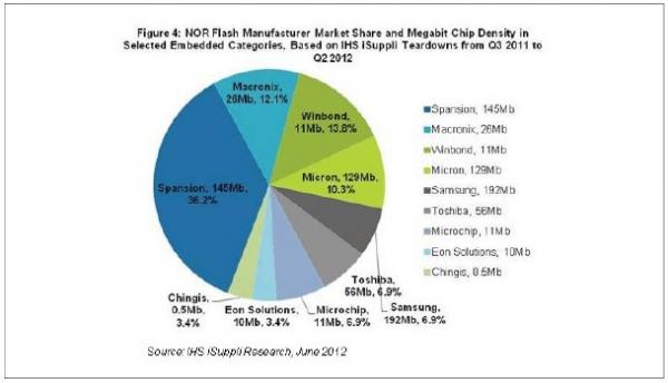 根據IHS iSuppli公司在三個季度內拆解分析的55個嵌入產品,這些產品中有三分之一以上的NOR芯片屬于美國Spansion Inc.,在所有供應商中處于領先地位,如圖所示。Spansion,以及韓國三星電子和美國美光,提供的NOR芯片平均密度為數(shù)百Mb。從2011年第三季度到今年第二季度,這三家公司占上述三個子領域中NOR芯片的53.4%。剩下的46.6%市場份額屬于生產100Mb以下密度NOR閃存的廠商。這類廠商包括臺灣旺宏電子和華邦電子等大型廠商,以及臺灣常憶科技和宜揚科技等規(guī)模較小的廠商。