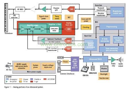 首先以超聲波設(shè)備為例來探討模擬性能需求。通過該范例,本文將介紹如何在性能、功耗、尺寸以及集成度之間進(jìn)行權(quán)衡,并檢測雙極性與CMOS工藝技術(shù)的適用性。圖1是典型超聲波機(jī)器的系統(tǒng)方框圖,展示了傳輸與接收兩個(gè)部分。這兩個(gè)部分負(fù)責(zé)驅(qū)動(dòng)傳感器與數(shù)字處理部分(未顯示),從而構(gòu)成完整的超聲波設(shè)備。